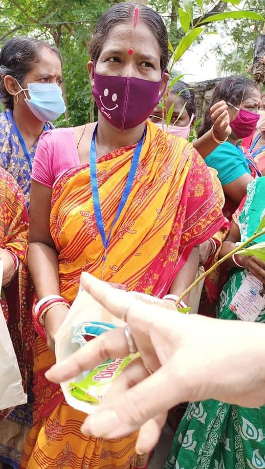 60 packs, each containing a pack of sanitary napkins, a bar soap, a sanitiser and 5 masks, were given away to the women.